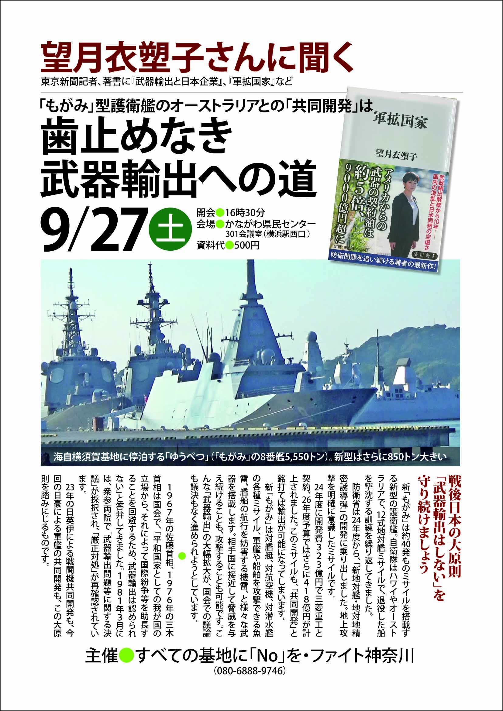 0.40回目のピースフェスティバル 1.7月の月例デモにトマホークアクションが合流たくさんのはつげんがありました。2025.7.25 2.沖本裕司さんからの沖縄だより 8月2日、辺野古県民大行動に600人 3.英空母「プリンス・オブ・ウェールズ」打撃軍の横須賀入港に抗議する 2025.8.11 4.寄せられたスピーチ案を萩谷海さんがまとめ、「おむすび丸」から英空母乗員へ呼びかけた。 5.英空母「プリンス・オブ・ウェールズ」入港抗議行動を終えて・深浦ボートパーク 6.集会宣言・第五厚木基地爆音訴訟勝利! 基地も武器も内社会をめざす8.30神奈川集会 7.30年以上、中東地域を不安定化させたトマホーク。そして、言わせてください。ガザ支援物資を!ミルクを!水を! 松本麻里さん2025.7.27ゲート前 8.米軍によるイラン核施設攻撃抗議と熱中症予防対策の義務化について 大井呑さん・2025.6.29商店街 9.払込用紙(等)のひとことから 10.海上自衛隊への巡航ミサイル・トマホーク配備撤回署名継続中・署名に御協力を 11.浜崎さんの横須賀滞在記・冊子完成200円 毎日新聞2025年6月12日 東京新聞2025年6月11日 銃警備抗議行動 6月4日朝日新聞神奈川版 歩道上の銃警備は許されない、米海軍横須賀基地抗議行動申し入れ 今井明さん撮影 横須賀基地司令官様 2025.5.29 非核市民宣言運動・ヨコスカ ヨコスカ平和船団 月例デモ参加者一同 いらない原子力空母・母の日パレード参加者有志 連絡先:横須賀市本町1?9 三協ビル3階 非核市民宣言運動・ヨコスカ 銃を携帯した米軍兵士による、基地の外の歩道上での警備行動について 謝罪と今後一切しない確約を求めます 写真は4月27日、横須賀基地ゲート前 3月30日、4月27日、「月例デモ の参加者に対し、米海軍横須賀基地のゲート前の歩道上で、防弾チョッキに身を固めた米軍兵士が小銃を手にして警備に立ち、デモ参加者を威嚇しました。 5月10日の「いらない原子力空母・母の日パレード」でも、小銃を手にした米軍兵士がゲート前の歩道上に立っていることが目撃されています。 イエローラインの外、国道16号線に沿った歩道上で、銃を手にした警備が許されるのか。 「在日米軍兵士の行動と日米地位協定に関する答弁書」(2001年11月2日)では 、地位協定17条の10を根拠に、「合衆国軍隊の構成員が銃を携帯して施設及び区域の外部で行動することは、それ自体が直ちに日米地位協定上問題になるものではない」とあります。 しかし、以下で詳しく検討するように、地位協定17条の10は、合衆国軍隊の構成員に関する軍事警察権の行使を定めたもので、デモ参加者の一般市民に当てはめることはできません。 3条管理権にも、「基地の近傍・隣接」での米軍の管理権が一部容認されていますが、デモ参加者に向けて、銃を携帯しての警備行動までは容認されていません。 5月25日の月例デモでは、基地ゲート前の歩道上に銃を携帯した兵士は確認されませんでしたが、3月30日、4月27日、5月10日の銃携帯警備の違法性の問題は残されたままです。 そこで関係4者は本日横須賀基地ゲート前に集合し、横須賀基地司令官へ、銃携帯警備の謝罪と、今後このような違法行為がないよう確約するよう要請いたします。 ● 以下、地位協定17条の10及び、3条の1、2について、私たちの見解を記します。 地位協定17条10 (a) 合衆国軍隊の正規に編成された部隊又は編成隊は、第二条の規定に基づき使用する 施設及び区域において警察権を行なう権利を有する。合衆国軍隊の軍事警察は、 それらの施設及 び区域において、秩序及び安全の維持を確保するためすべての適当な措置を執ることができる。 (b) 前記の施設及び区域の外部においては、前記の軍事警察は、必ず日本国の当局との取 極に従うことを条件とし、かつ、日本国の当局と連絡して使用されるものとし、 その使用は、合 衆国軍隊の構成員の間の規律及び秩序の維持のため必要な範囲内に限るものとする。 ● 17条10(a)は米軍に「施設及び区域において警察権を行なう権利」を定めています。 (b)で「施設及び区域の外部」における「軍事警察」権を定めていますが、「必ず日本国の当局との取 極に従うことを条件」とされています。 重要なのは「合衆国軍隊の構成員の間の規律及び秩序の維持のため必要な範囲内に限るものとする」という箇所です。 17条10の「合衆国軍隊の軍事警察」行為は、「合衆国軍隊の構成員の間の規律及び秩序の維持のため必要な範囲内に限る」もので、基地の外の一般市民を対象としたものではありません。 外務省の機密文書「地位協定の考え方」には、合同委員会合意「刑事裁判管轄権に関する合意事項」を根拠に、現行犯については「米軍警察権は日本国民にも及ぶ」と解説されていますが、 その理由を「現行犯人は、我が国の法令上、一般私人でも逮捕しうるのであるから、米軍当局によるこれら自衛的な措置が認められる」としています。 しかし「刑事裁判管轄権に関する合意事項」では、「米軍当局の自衛的な措置」が可能なのは、「犯罪の既遂又は未遂